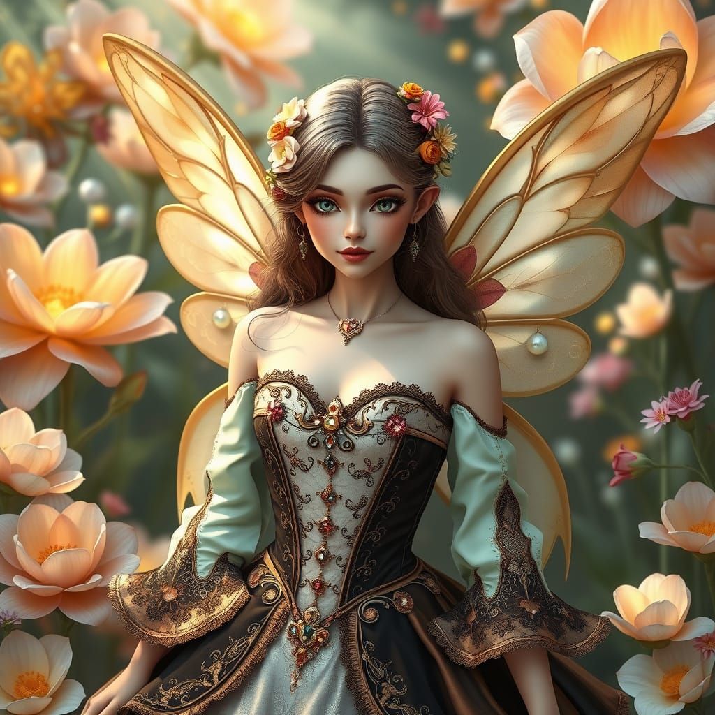 A striking picture of a porcelain-skinned fairy goddess adorned with flowers and gems. She wears an elaborate Rococo dress with a corset and silk sleeves, complemented by large, pearlescent wings in a bright, divine style.