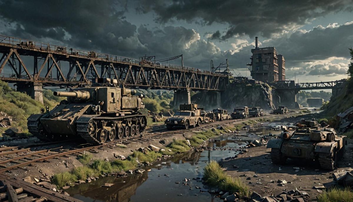 A striking picture of a heavy military gun on a bridge in a ruined industrial wasteland. The image is evocative of 1940s dieselpunk style, with a dark moon, gears, boxes, and detailed textures.
