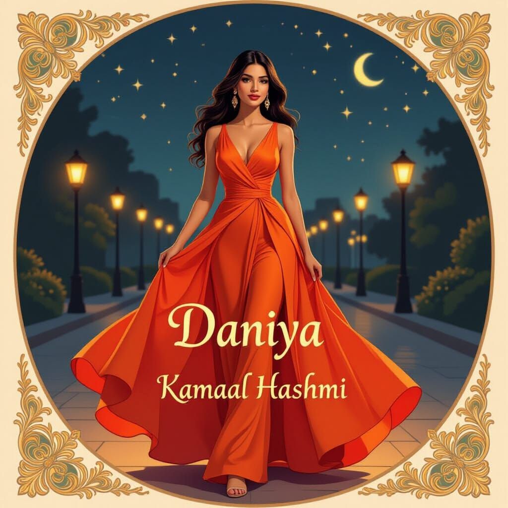 This image shows a woman in a vibrant orange dress at night. The artwork features intricate details and warm, golden lighting, in the style of digital painting and Art Nouveau.