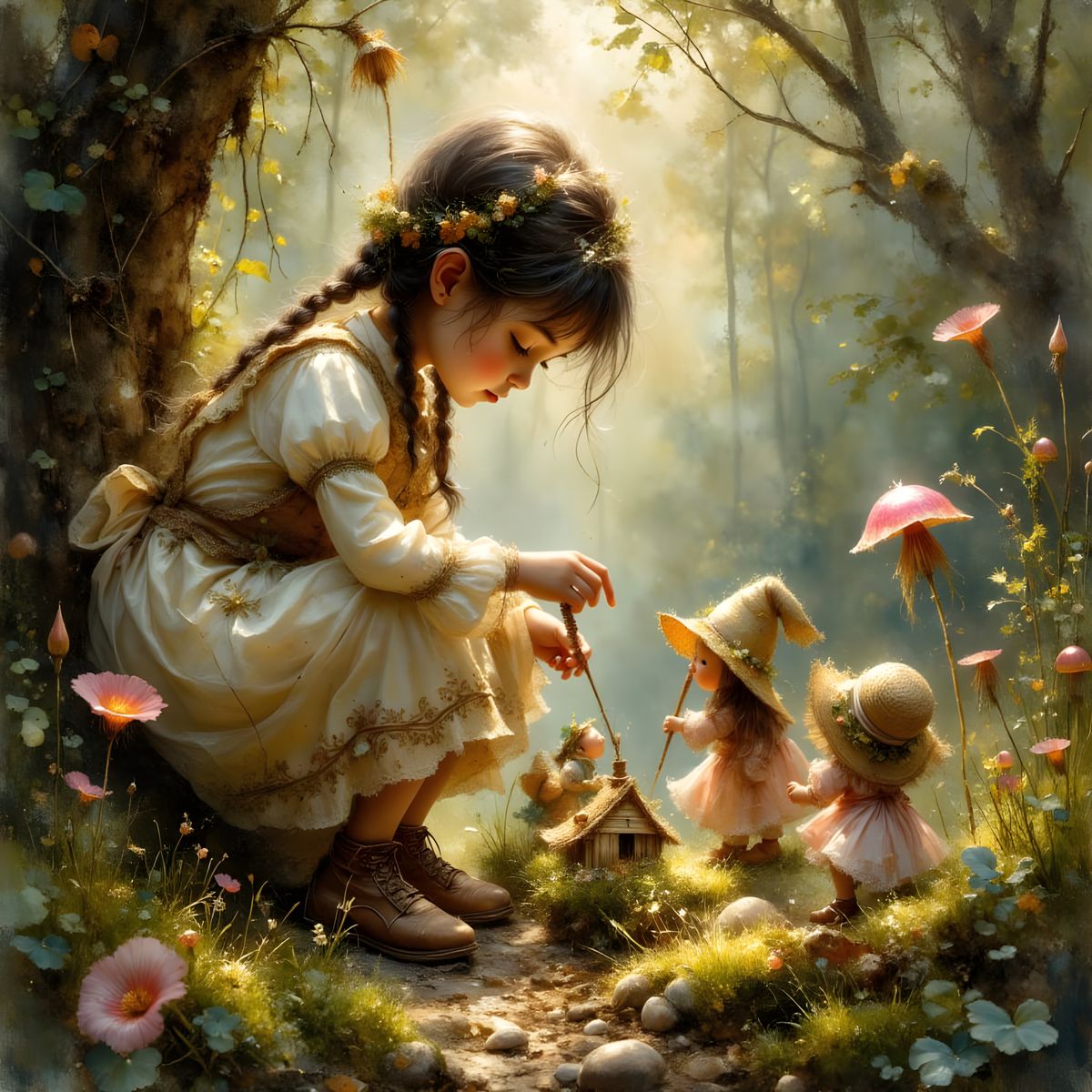 This image shows a girl assisting porcelain dolls in building a twig house within a sun-dappled woodland. The photorealistic scene emphasizes textures like woven fabric and rough bark, with muted forest tones.