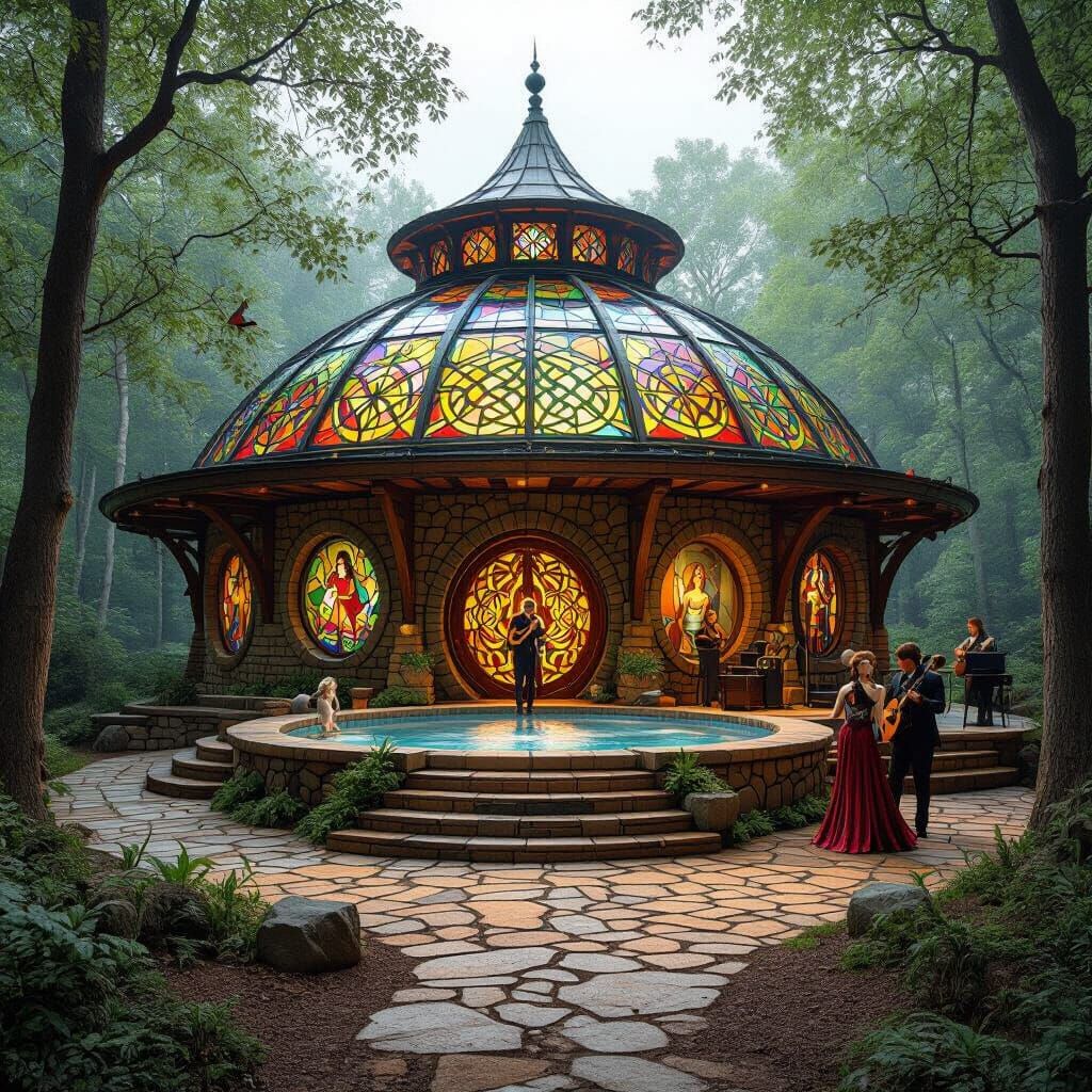 A photorealistic image of a massive round temple nestled in ancient woodland. The temple features a stained-glass dome, Celtic knotwork, wattle and daub walls, goddess art, and a stage with band, all in vibrant colors.