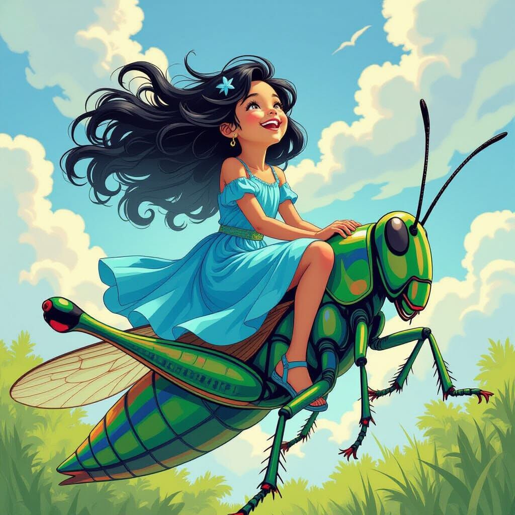 This image depicts a joyful girl with long black hair, wearing a blue dress, riding a giant grasshopper through the sky. The art features smooth lines and vibrant colors, inspired by comic book illustration.