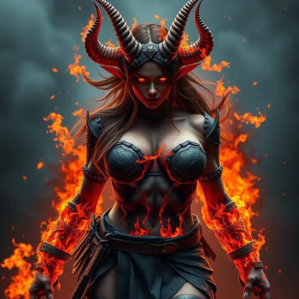 This image shows a powerful warrior woman emerging from a hellscape. She wears dark metal armor etched with demonic runes. Flames surround her arms, and fog fills the battlefield in this ultra-detailed digital art piece.