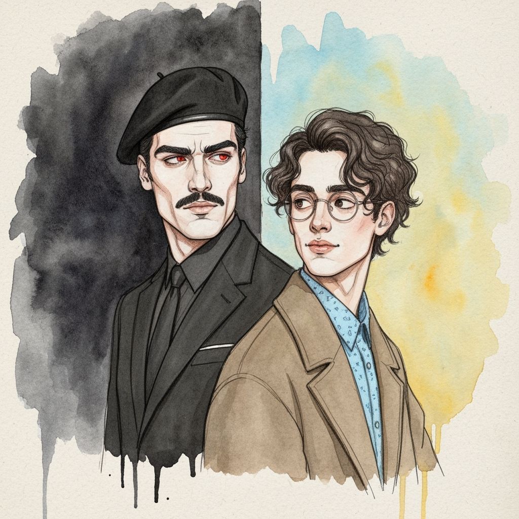 This image features high-fashion croqui illustrations of two young men. One wears a dark suit and beret with a stern look, the other a patterned shirt and coat with a shy expression. Rendered with pencil and watercolor washes.