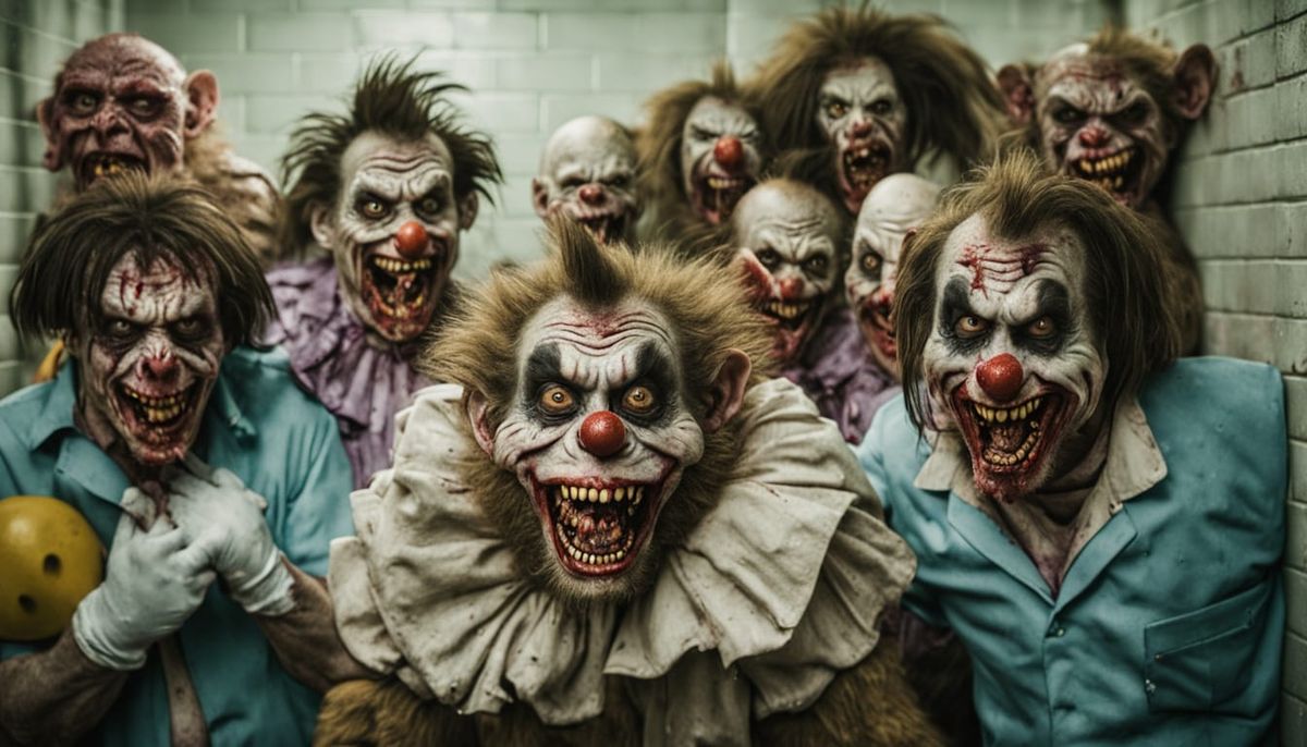 This image shows a disturbing group portrait of a zombie monkey monster clown in a mental hospital setting, captured with professional photography techniques and high-resolution detail.