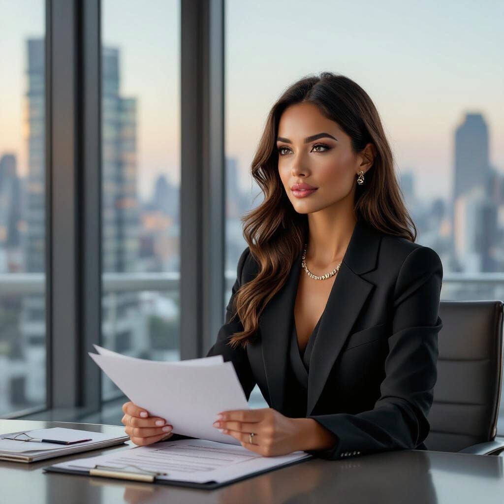 This image shows a stylish black woman in a black blazer, holding documents, sitting in a luxurious financial office. The background features high-end real estate in a hyperrealistic digital art style.