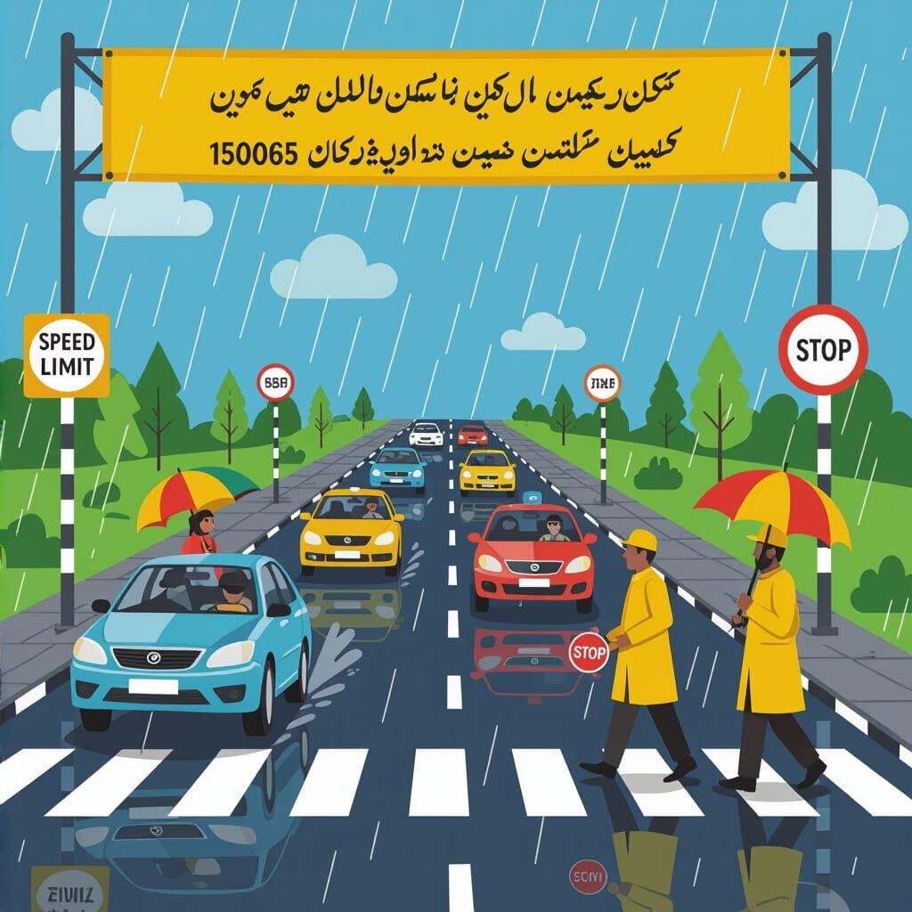 This image shows a vibrant illustration promoting road safety in Pakistan during rainfall. Cars drive cautiously on wet roads as pedestrians use zebra crossings. Traffic police guide with stop signs in an educational poster style.