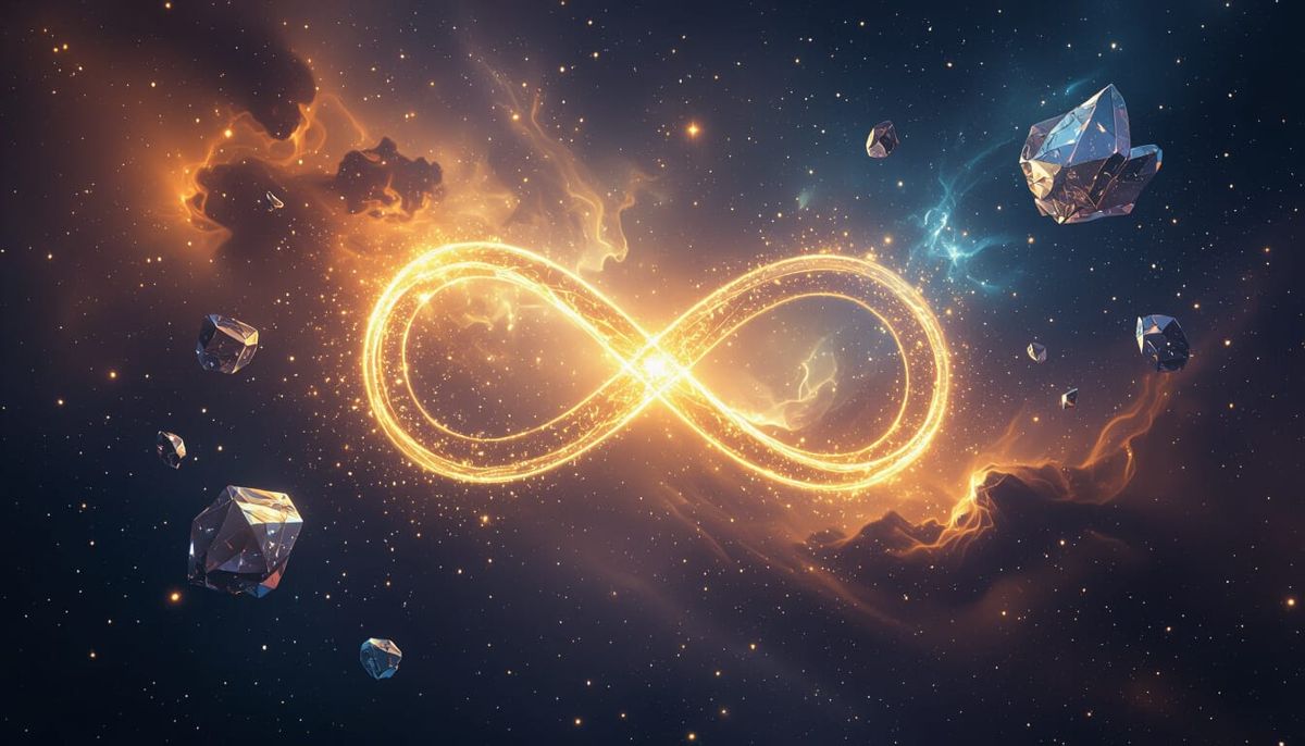 This image shows a glowing golden infinity symbol at the center of a vibrant cosmic nebula with colorful star formations. Shimmering crystals drift around the symbol, creating an elegant, vast deep space ambiance.
