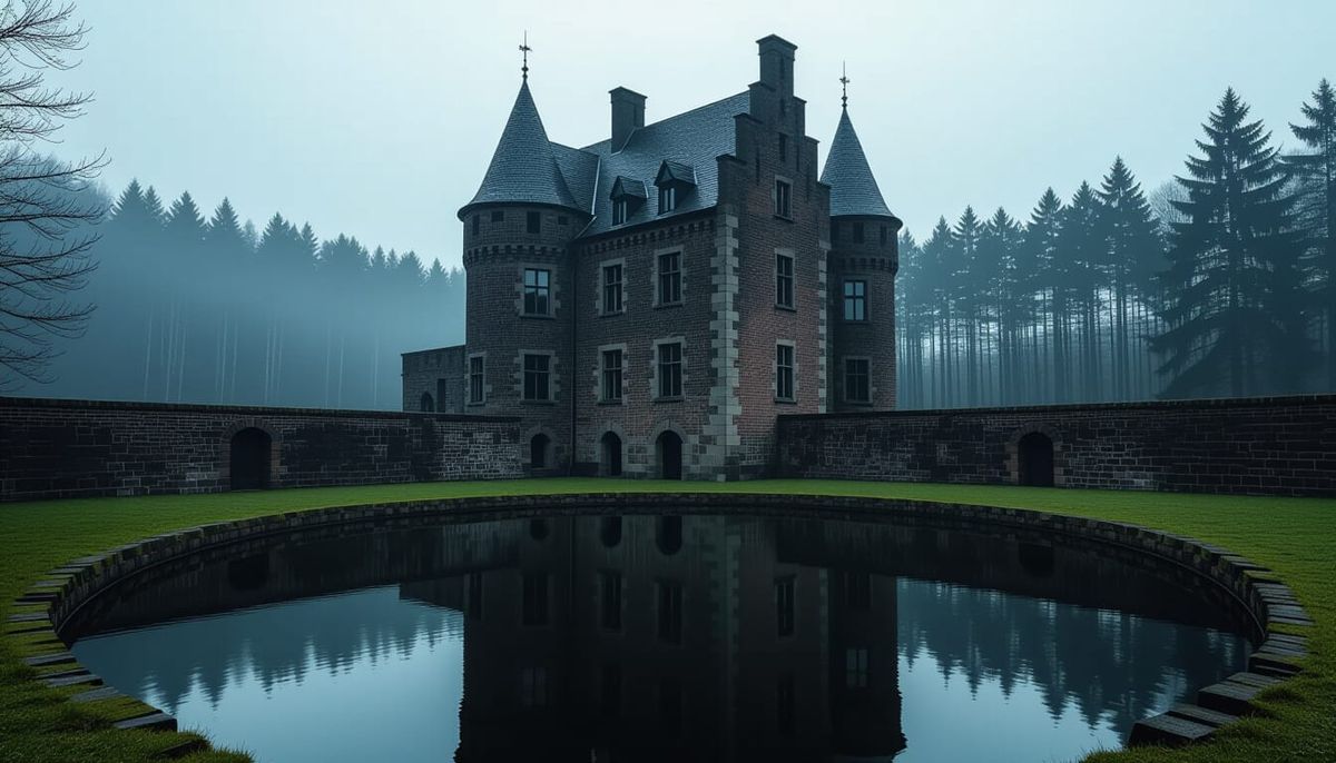 A striking picture of a fortress-like building on a walled estate, reflected in a still pond. A dense forest looms behind the structure in a grim, cold atmosphere, depicted in a dark, industrial aesthetic.