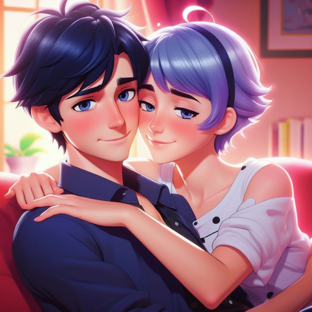 This image shows a romantic scene of a couple embracing. The artwork features vibrant, sparkling eyes, soft lighting, and a pastel color palette, reminiscent of Japanese manga and anime key visuals.