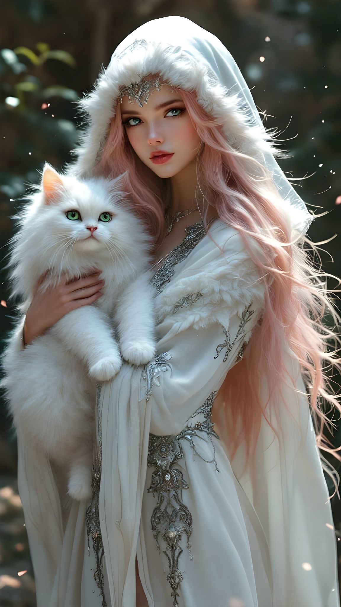 This image showcases a mystical young woman with piercing eyes, surrounded by an aura of wonder, accompanied by a majestic, furry creature, rendered in vibrant triadic colors with intricate detail and dynamic lighting, evoking a sense of enchantment and fantasy.