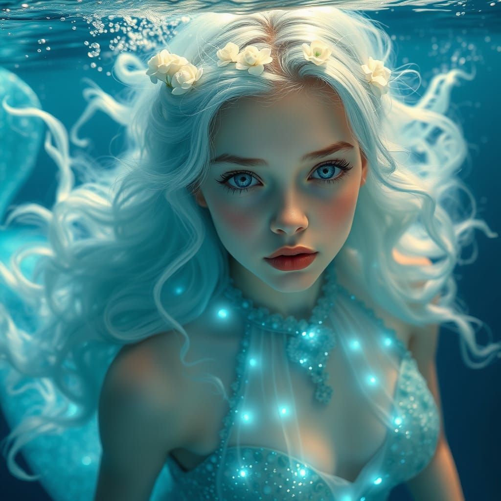 Mermaid girl, teenager, fair skin, piercing blue eyes, calm and focused expression, long and wavy white-blue hair, decorated with white flowers. Sparkling dress, turquoise blue, transparent, floating above the water, with sparkling blue lights in the hair and dress. Underwater, underwater view. The water ...