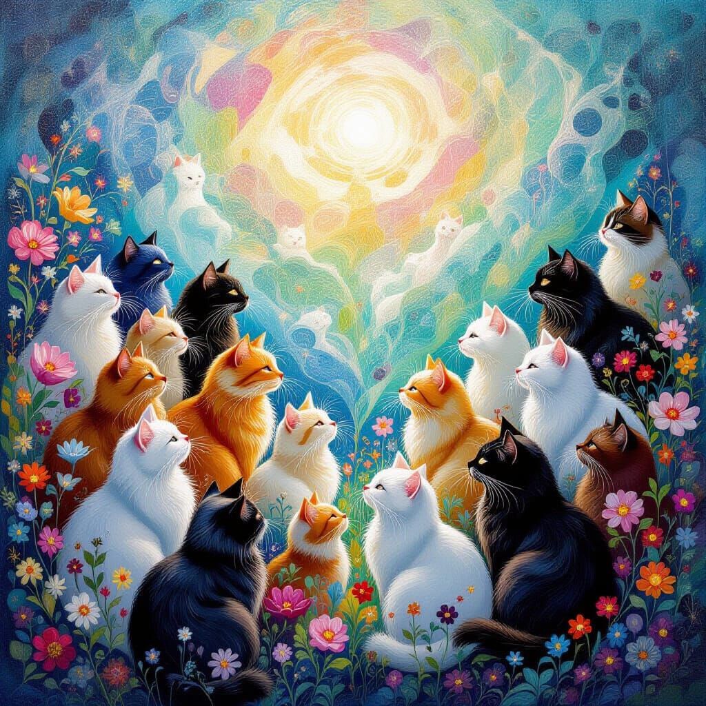 This image depicts a spiritual scene with many cats in a cosmic setting. The artwork is reminiscent of healing art with calming colors and serial structures.