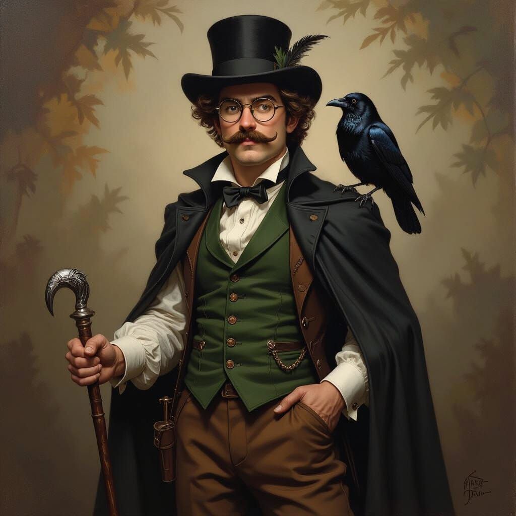 A halfling man about thirty years in age. He wears no shoes on his feet. He wears knee length brown trousers. He has a green vest overtop a white shirt. On his bespectacled face he has a roguish handlebar mustache. His hair is brown. A top his head he wears a black bowler hat, that matches the black cloak he wears. He has a walking stick in his left hand topped with a silver raven's head. Sitting atop hit right shoulder is a raven.