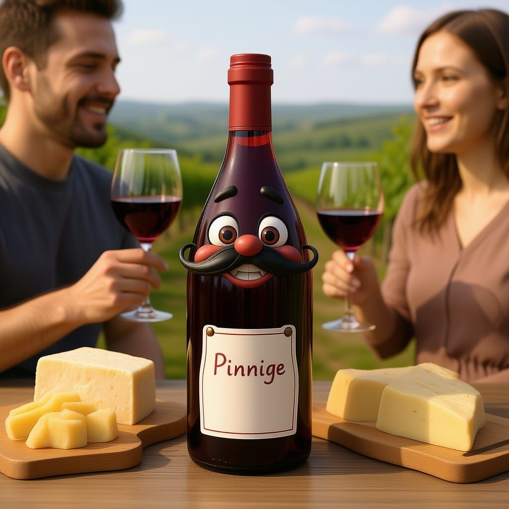 This image shows a 3D cartoon rendering of a French Pinotage wine bottle. The bottle is anthropomorphized with arms, legs, expressive eyes, a moustache, and wears a chef's apron.