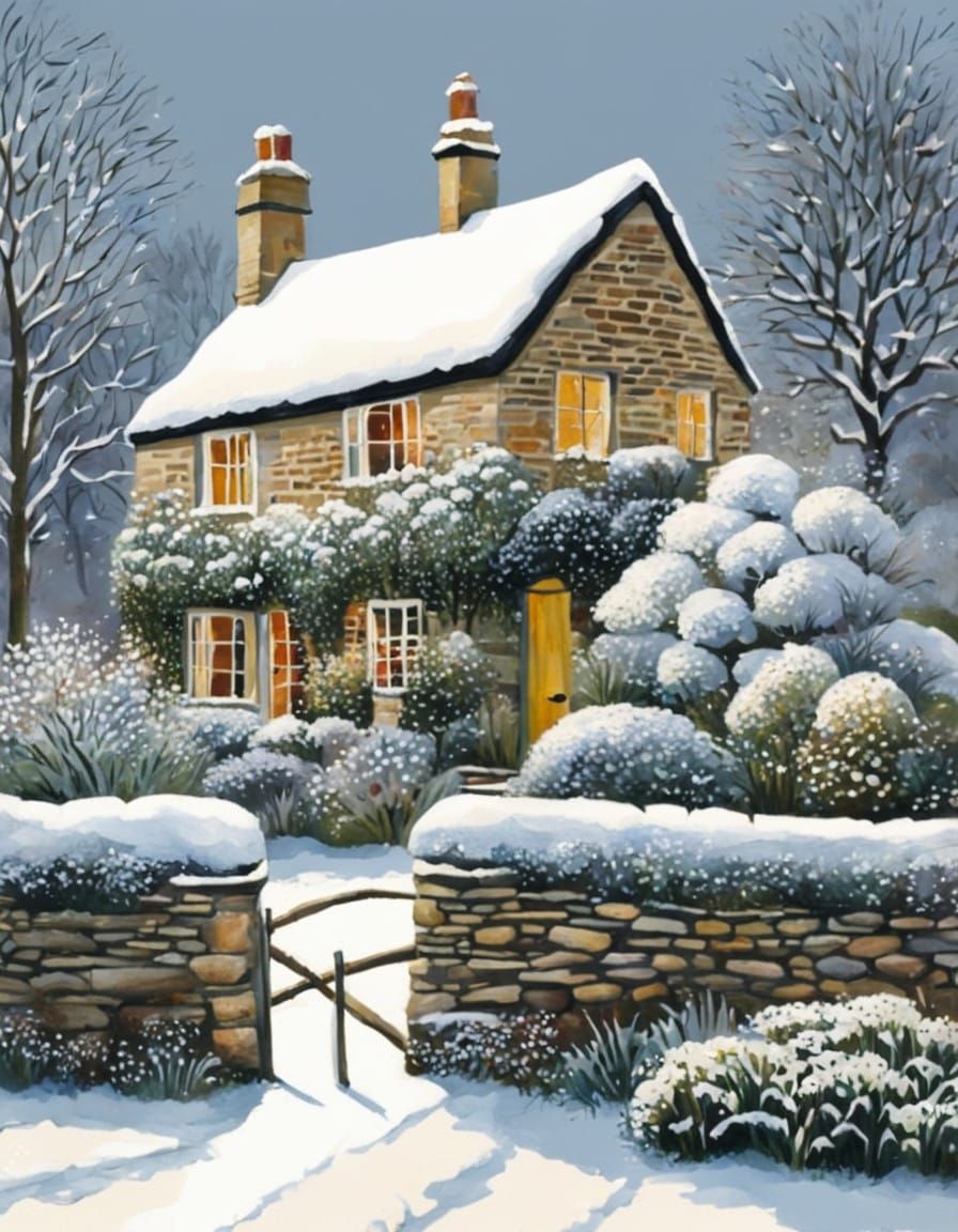 A charming winter scene of a Cotswold cottage garden blanketed in snow. The artwork blends modern folk art with impressionistic techniques, reminiscent of textile patterns and traditional English art.