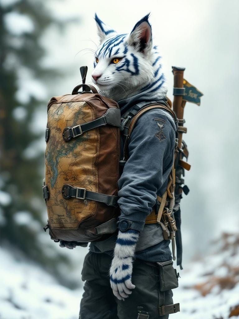 A slender, athletic liger furry with blue and white stripes is depicted with a hiking pack and map. The character's destination is a mysterious location, rendered with atmospheric lighting.