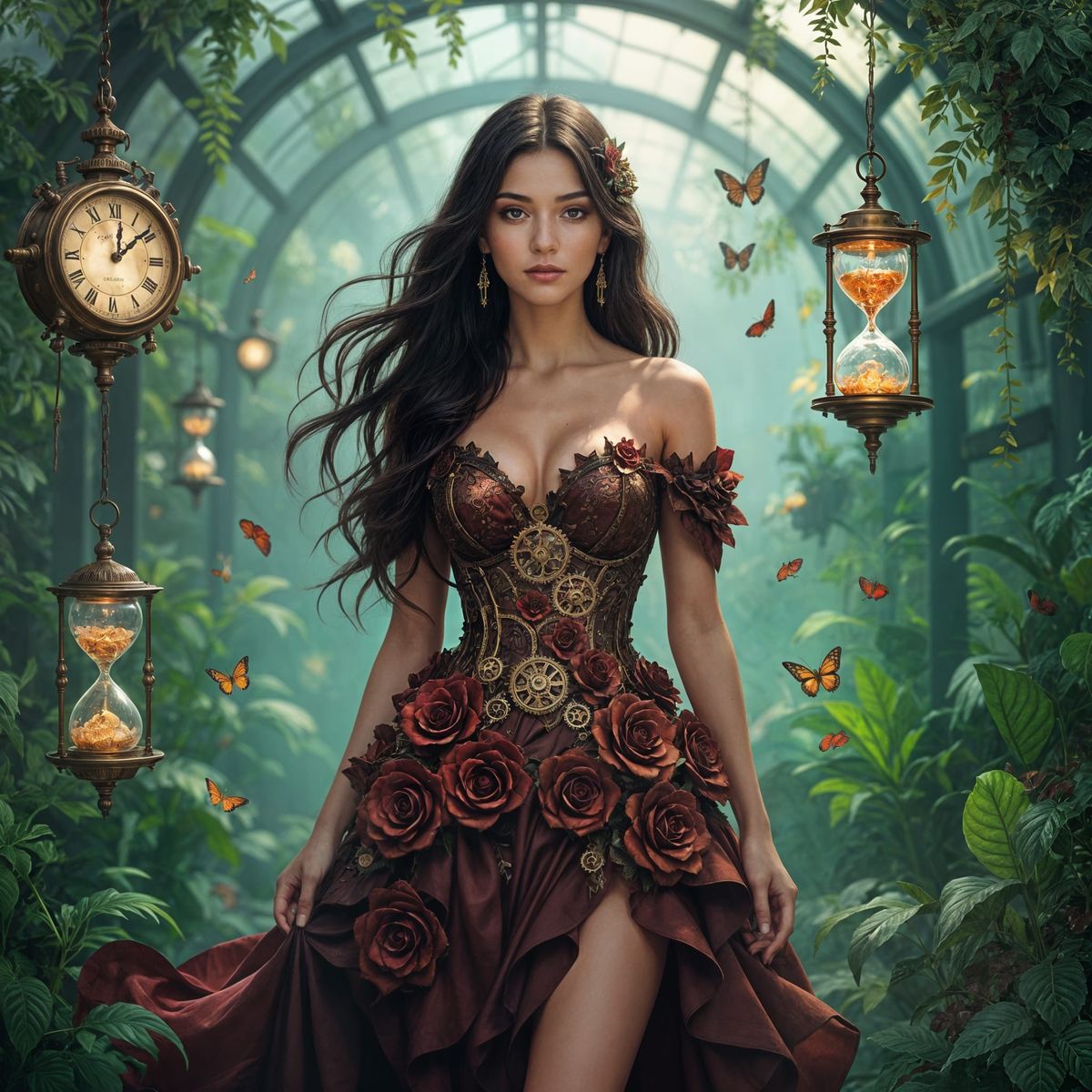 A surreal image of a woman in a steampunk greenhouse. She wears a dress of roses and gears amidst glowing plants and clockwork. The scene is mystical and dreamlike with brass and alchemical symbols.