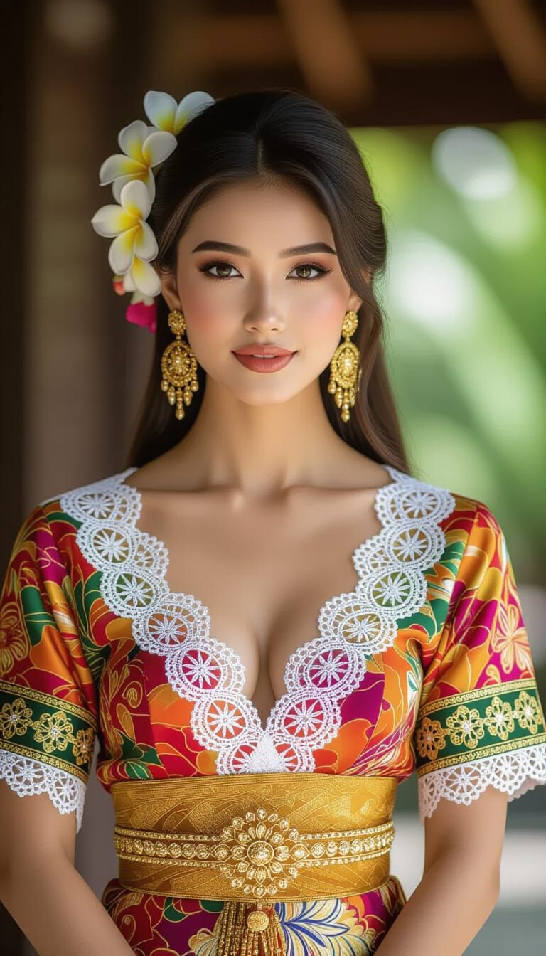 This image shows a hyperrealistic Balinese woman in traditional ceremonial attire. She wears a colorful kebaya with lace details, gold accessories, and a flower crown, against a softly blurred Balinese backdrop. The image has cinematic lighting.