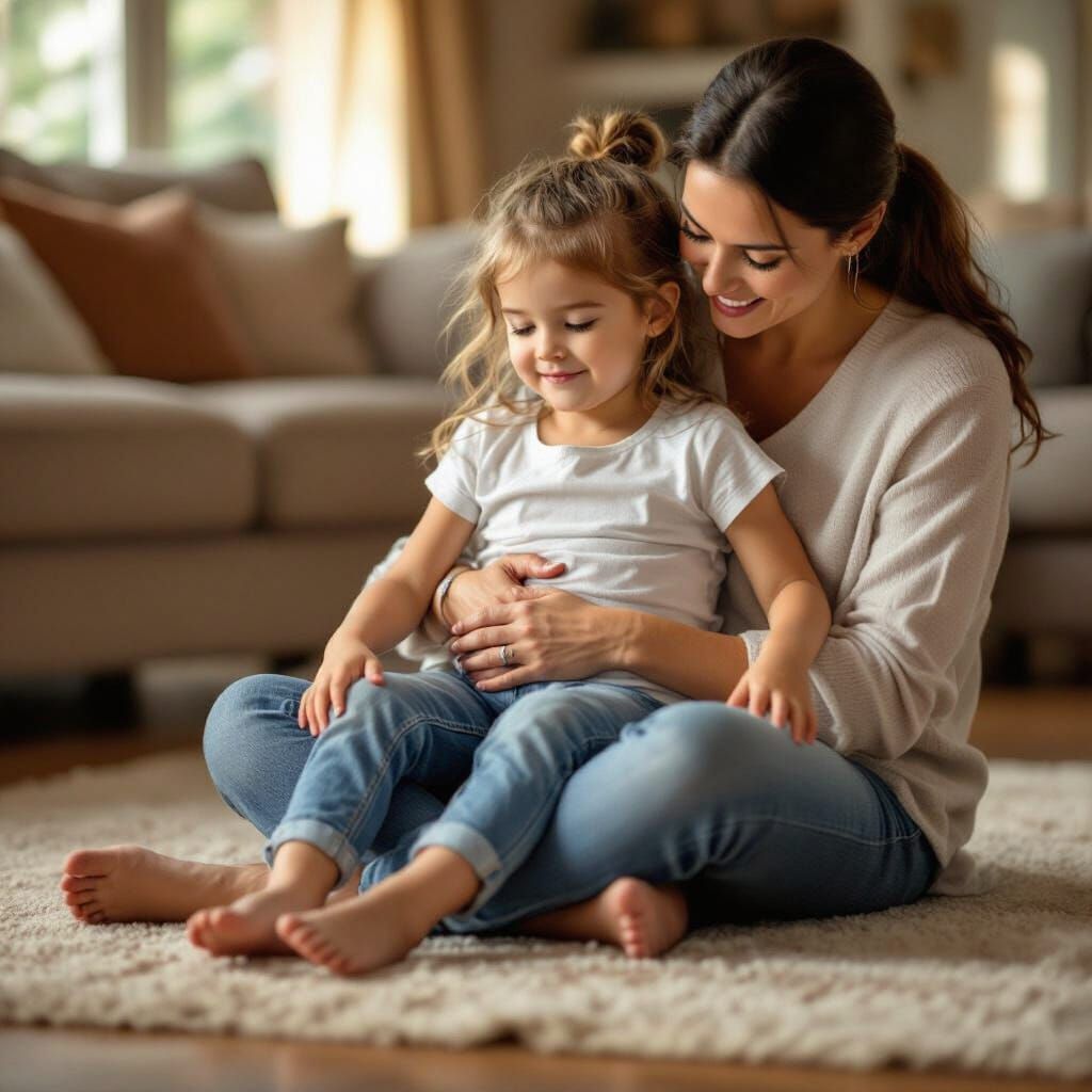 A photograph captures a mother spanking her young daughter over her knee in a cozy living room. The image features soft lighting and a blurred background, presented as a sharp, emotive portrait.