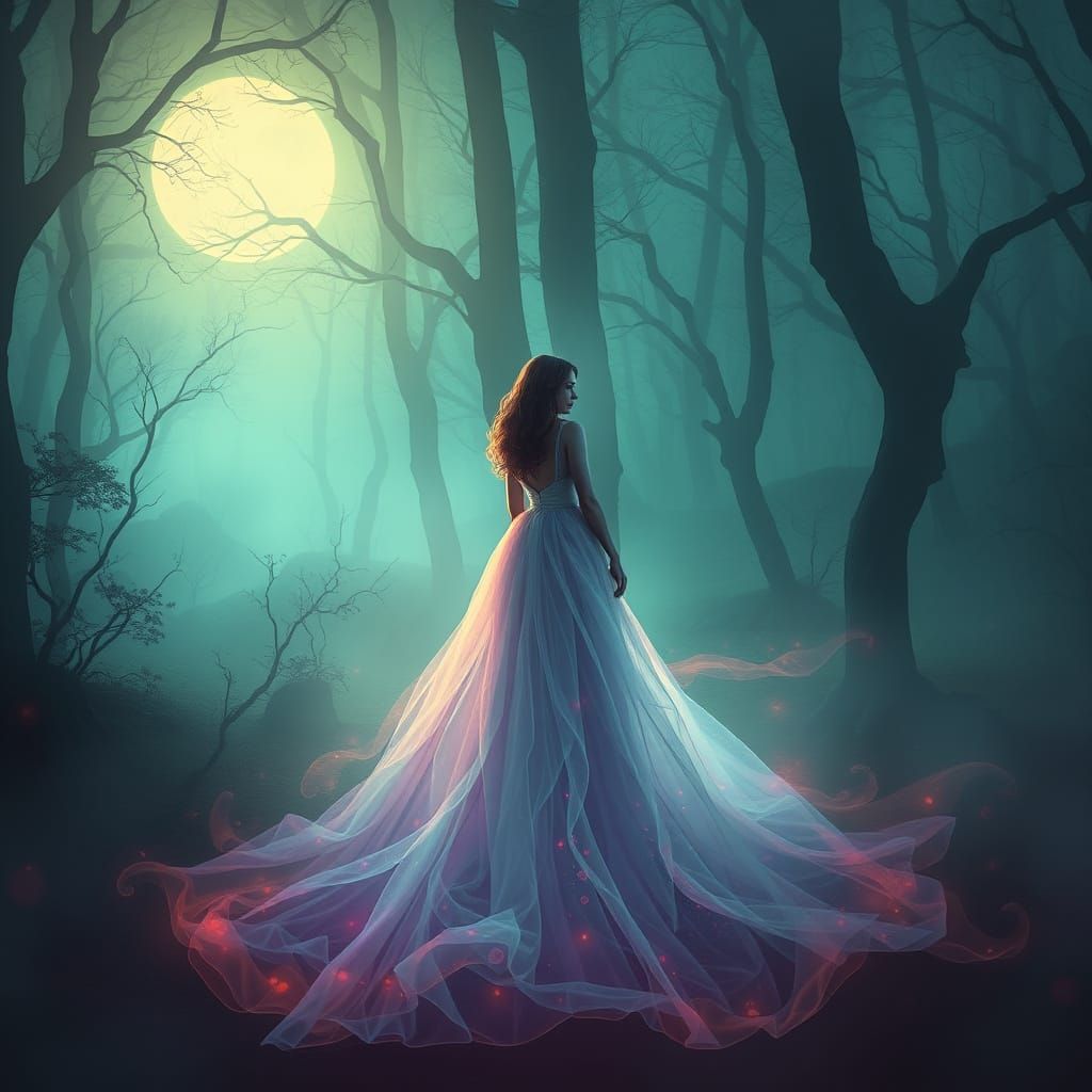 This image shows a woman in a gown standing in a misty forest under moonlight. The artwork features vibrant, ethereal colors and swirling patterns, in a soft, dreamlike aesthetic.