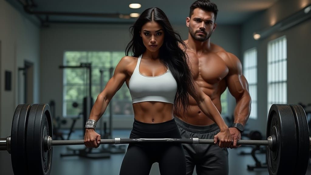 This image shows a beautiful Indian woman lifting weights in a gym with her trainer. The artwork features dramatic lighting, bold colors, and intricate textures in a hyperrealistic style.