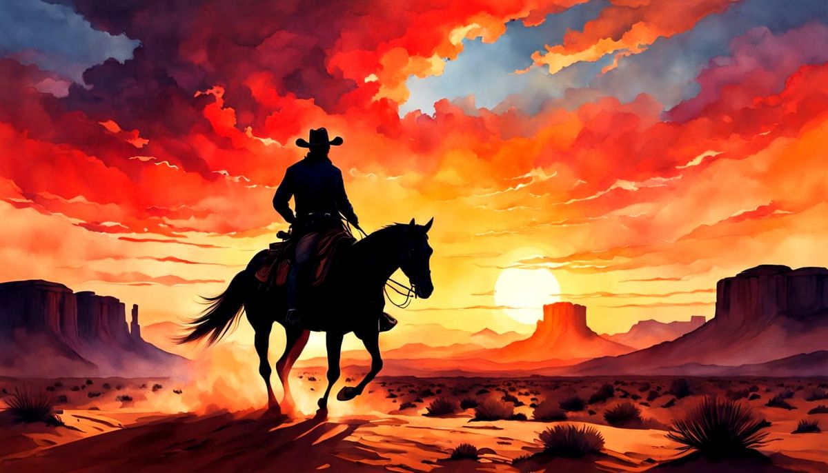 This watercolor painting shows a cowboy on horseback as a dark silhouette against a desert sunset. The sky features vivid orange and red hues, creating a wondrous and epic scene.