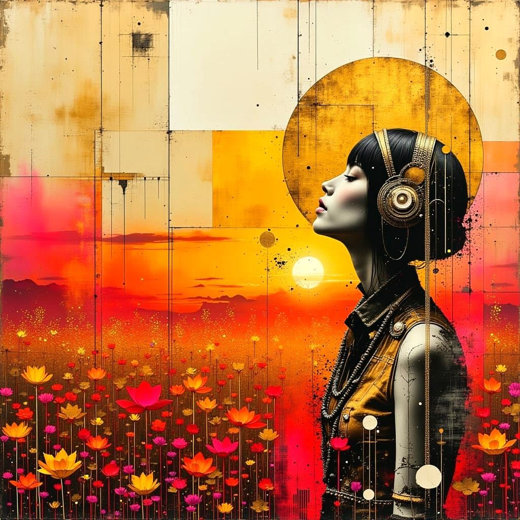 This image showcases a beautiful woman amidst a vibrant wildflower meadow, capturing the warmth of sunshine in a colorful and textured scene with elements of modern art and abstract patterns.