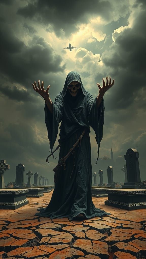 "Imagine the Grim Reaper standing ominously on a cracked earth landscape, his tattered cloak billowing in the wind. Ghostly hands reach up from the ground, begging for salvation as the skies darken with swirling storm clouds. The background features ...