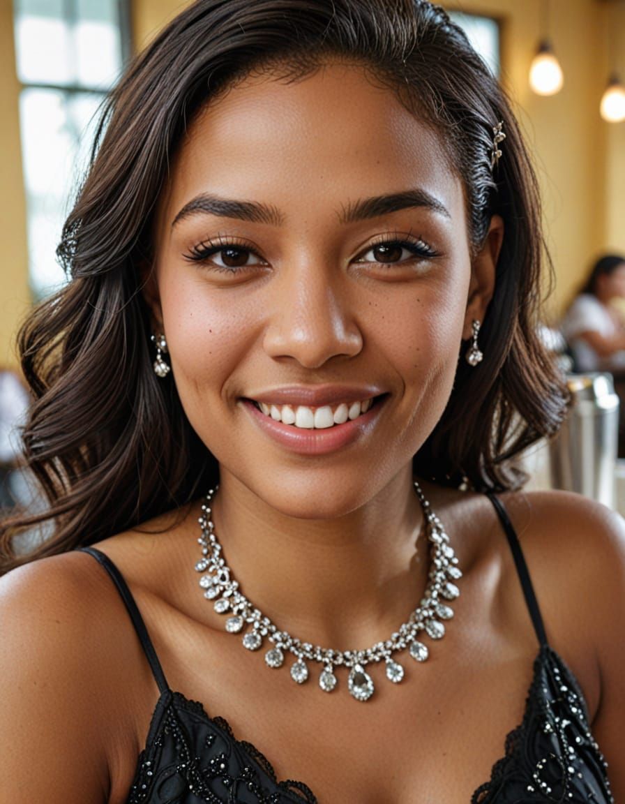 This image shows a close-up hyperrealistic portrait of a smiling 22-year-old Dominican woman in a gothic dress with a silver necklace. The digital photo emphasizes detailed textures and soft, natural, cinematic lighting.