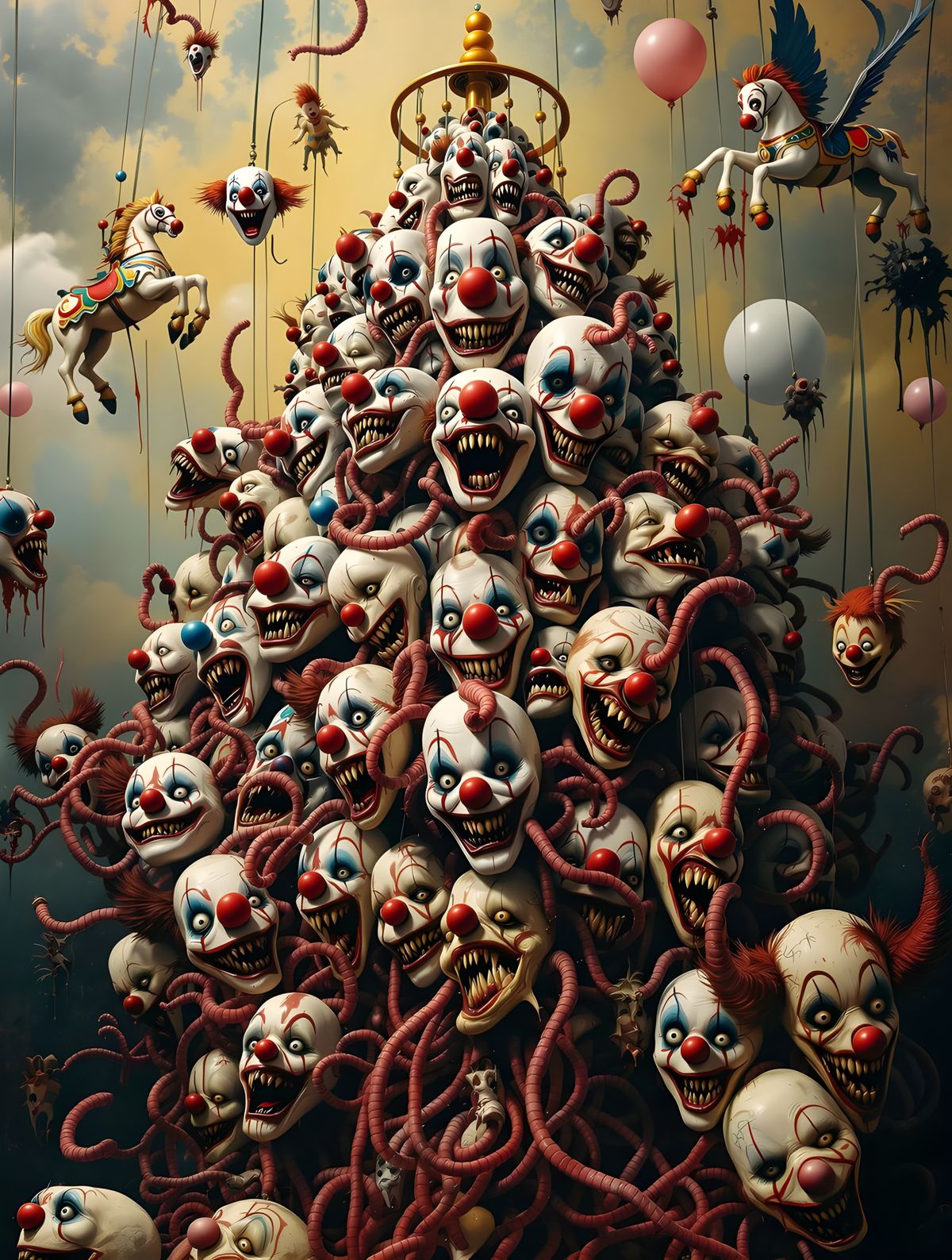 This image shows a terrifying collage of grotesque clown faces fragmented and overlapping in a void of smeared paint and balloon entrails, in a Boschian horror style with uncanny fairground hues.