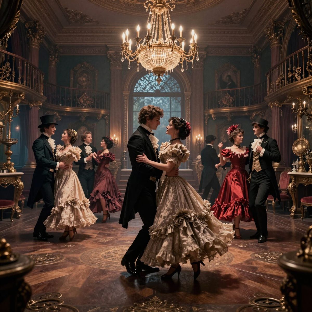 This image captures a Victorian-style dance party within an ornate room. It features deep colors and intricate details, rendered in a cinematic, fantasy concept art style.