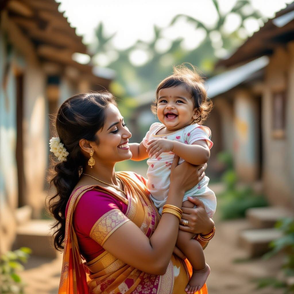 This image showcases a radiant Bengali mother in a colorful sari holding her laughing baby daughter aloft in a village yard. Photorealistic, with cinematic lighting and bokeh, it captures pure affection.