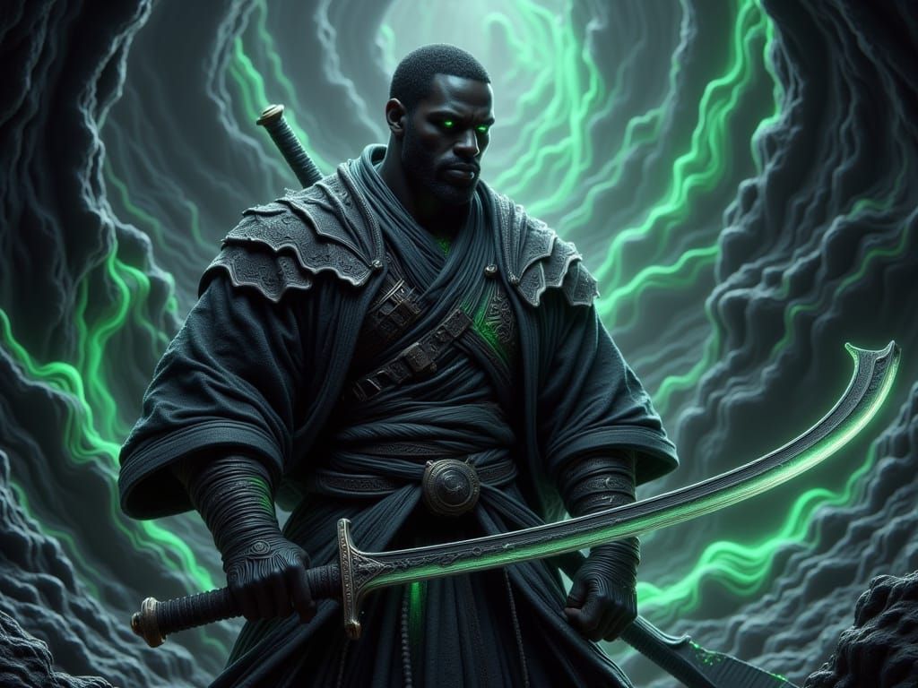 This image shows a muscular Black warrior standing firm in swirling shadows. He wears tattered combat gear and grips an obsidian katana, his emerald eyes gleaming in the darkness, lit dramatically. A dark fantasy aesthetic.