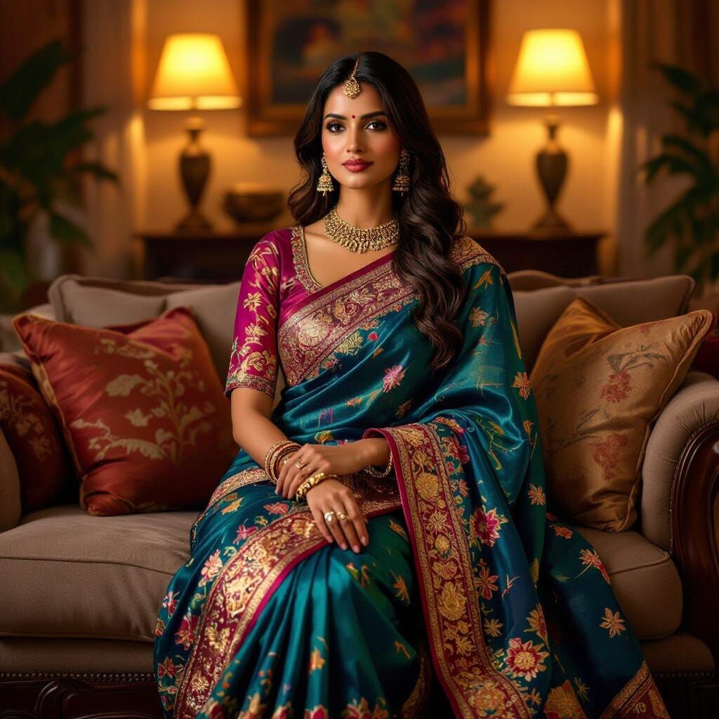 A serene Indian woman sits in a cozy living room. She wears a vibrant sari with intricate embroidery in this image, which blends realistic and impressionistic styles.
