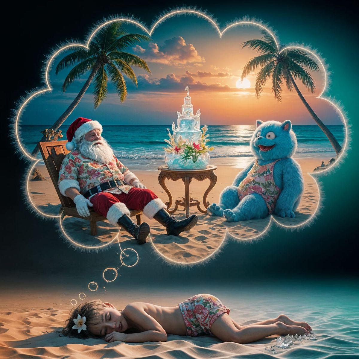 This digital art captures a surreal dreamscape: Santa in beachwear lounges with a furry monster on a tropical beach, near an ice sculpture, within a thought bubble. Features a golden sunset.