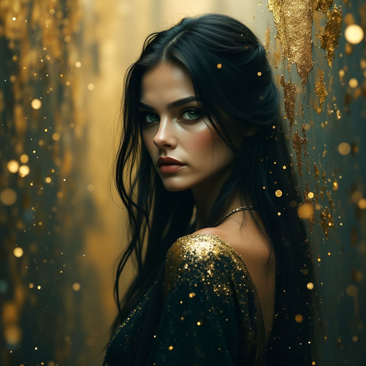 This image features an over-the-shoulder cinematic portrait of a woman in her early thirties. She stands in a surreal, atmospheric void with swirling golden mist and smoky textures.