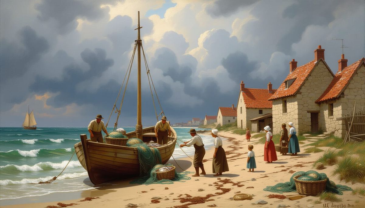 This image depicts a rustic fishing village with fishermen hauling a boat ashore amidst dramatic storm clouds. Inspired by the realistic and romantic styles of 19th-century painters.