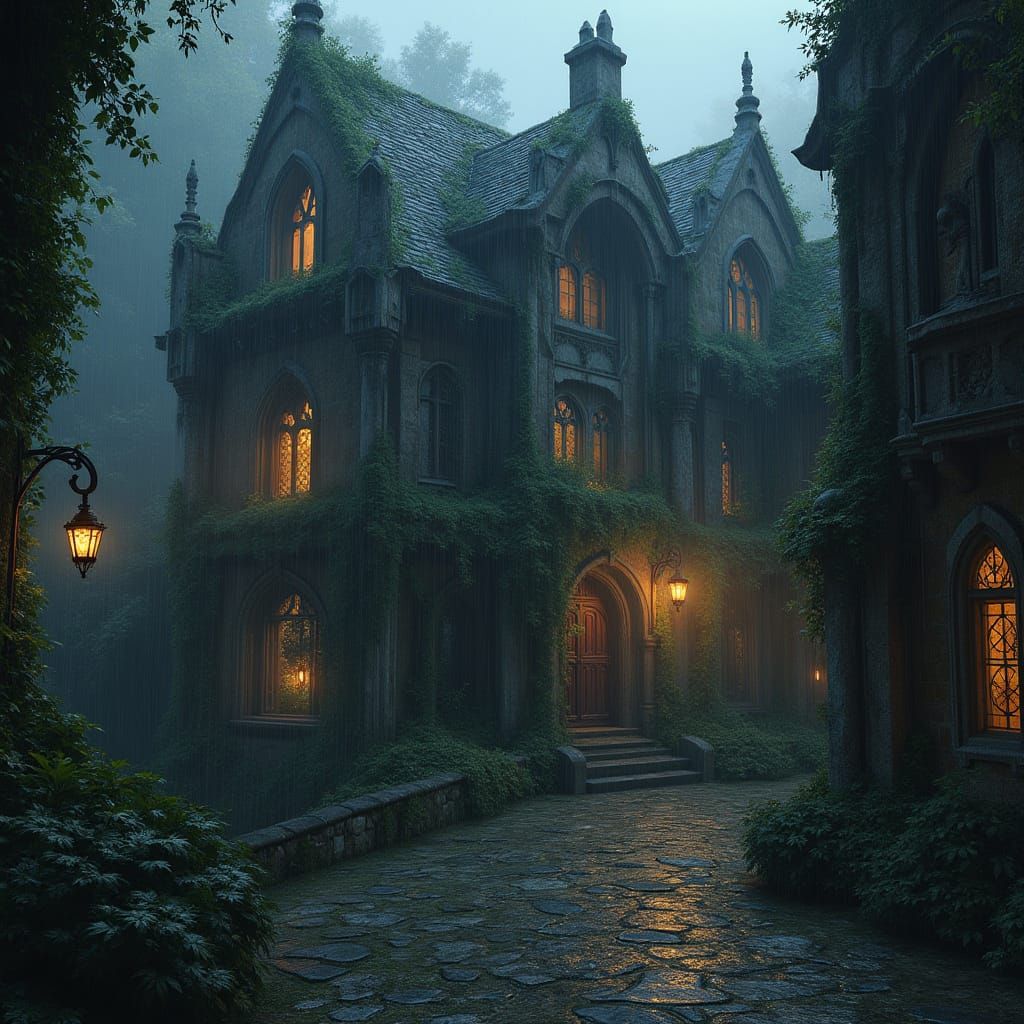 This haunting image shows a mystical gothic hospice enveloped in misty rain, with intricate stone carvings, twisted gargoyles, and warm, golden lanterns. Rich, photorealistic textures and deep colors evoke a sense of foreboding and mystery, blending the eerie with the beautiful in a dark, gothic fairy ta...