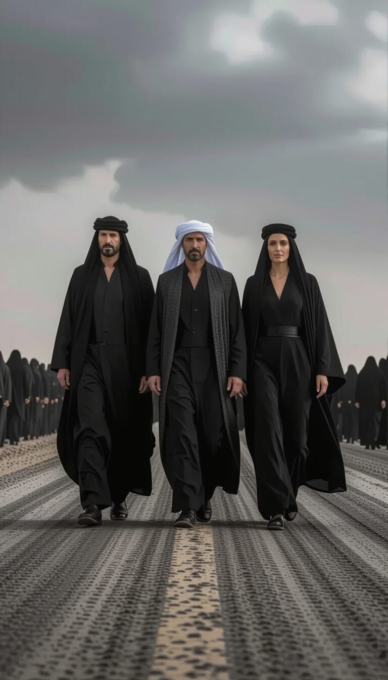 This image shows Tom Cruise, Jason Statham, and Angelina Jolie in black Arabic robes, walking together during the Arbaeen pilgrimage. The scene is captured with realistic lighting and impressive depth of field, in a documentary photography style.