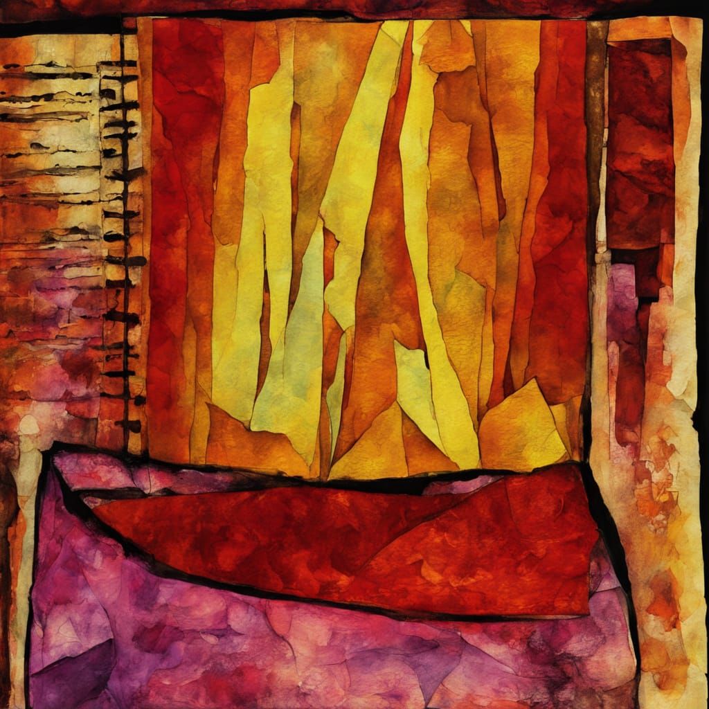 This image features a close-up of a warm, glowing fireplace with crackling logs. It utilizes wet-on-wet watercolor and ink engraving with impasto texture in sunset hues, evoking expressive motion and lyrical abstraction.