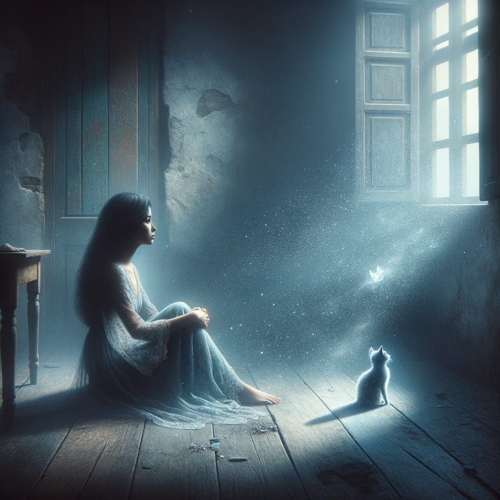This poignant image captures a moment of quiet contemplation, as a woman sits alone in a dimly lit room, surrounded by the remnants of a lost pet. The soft, muted colors and intricate details evoke a sense of nostalgia and longing, inviting the viewer to reflect on the bittersweet nature of memory and lo...