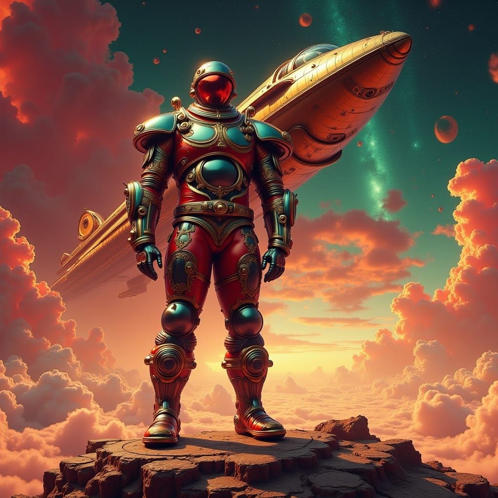 A nostalgic sci-fi illustration of Captain Kidd standing on a planetary surface, surrounded by a galaxy landscape, in a 1950s-inspired retro-futuristic setting, evoking the style of classic pulp art and cinematic futurism.