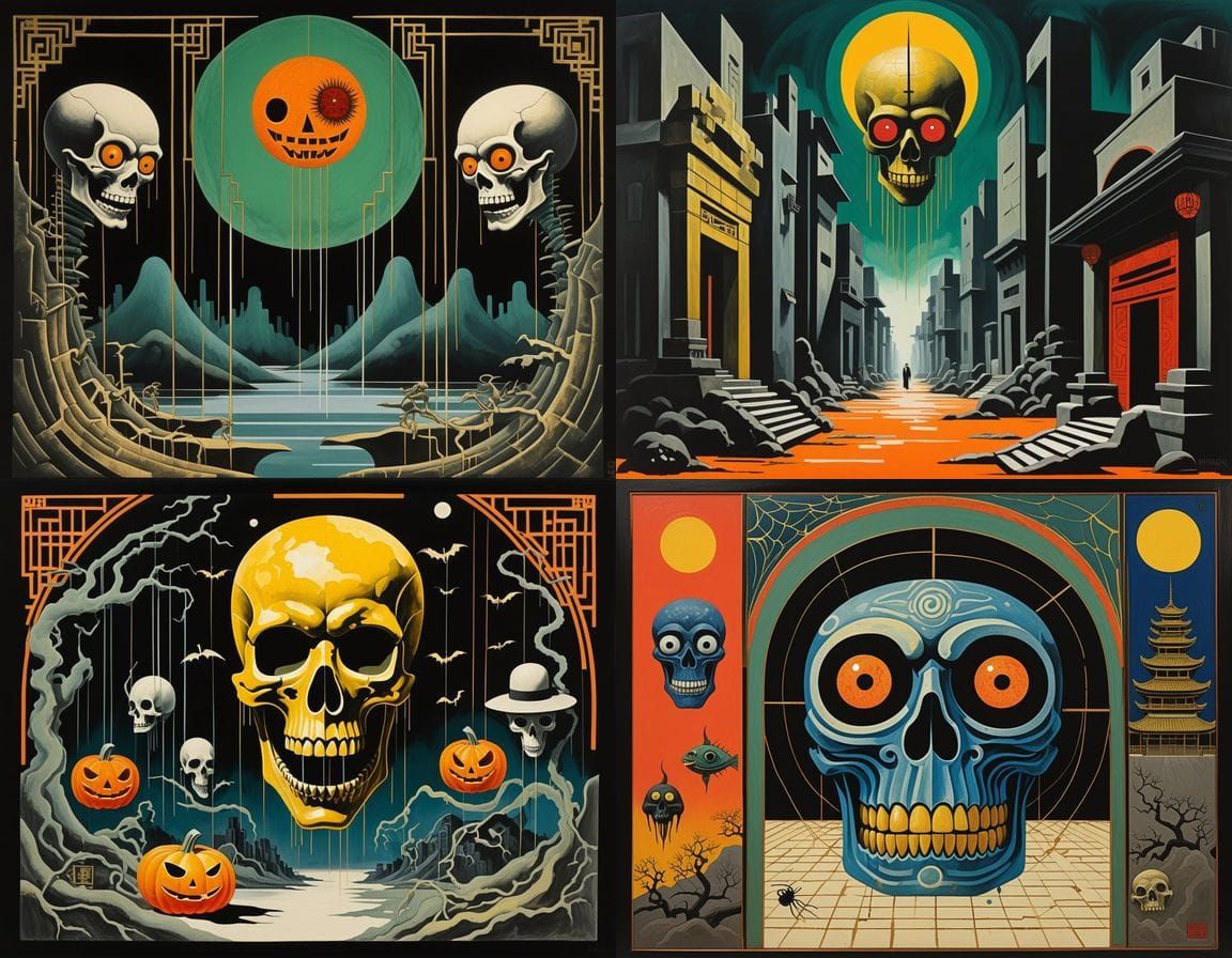 This image depicts a surreal and horrific scene in a brutal 1950s Japanese style, featuring mutated creatures and unsettling imagery with mineral pigment colors.