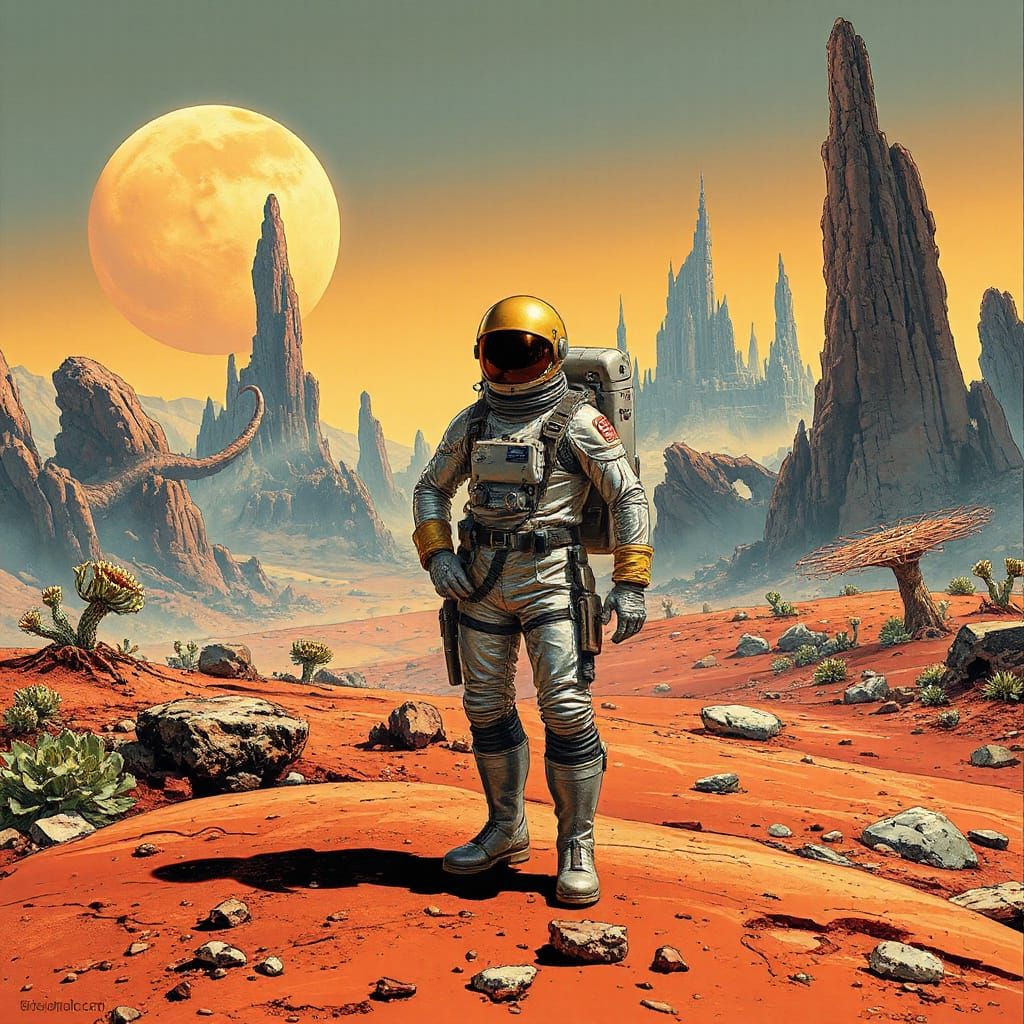 This image is a vibrant, retro-futuristic illustration of a lone astronaut standing heroically on a distant planet's rust-red surface, surrounded by an ancient alien cityscape and strange, glowing flora.