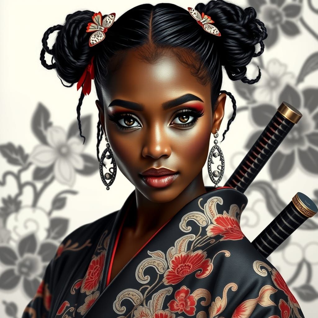 A glamorous, chibi-style digital illustration of a light-skinned Creole African American woman with freckles. She has large, expressive eyes with dramatic lashes and a confident gaze. Her hair is styled in two elegant, voluminous buns with loose curly strands framing her face, adorned with decorative ...