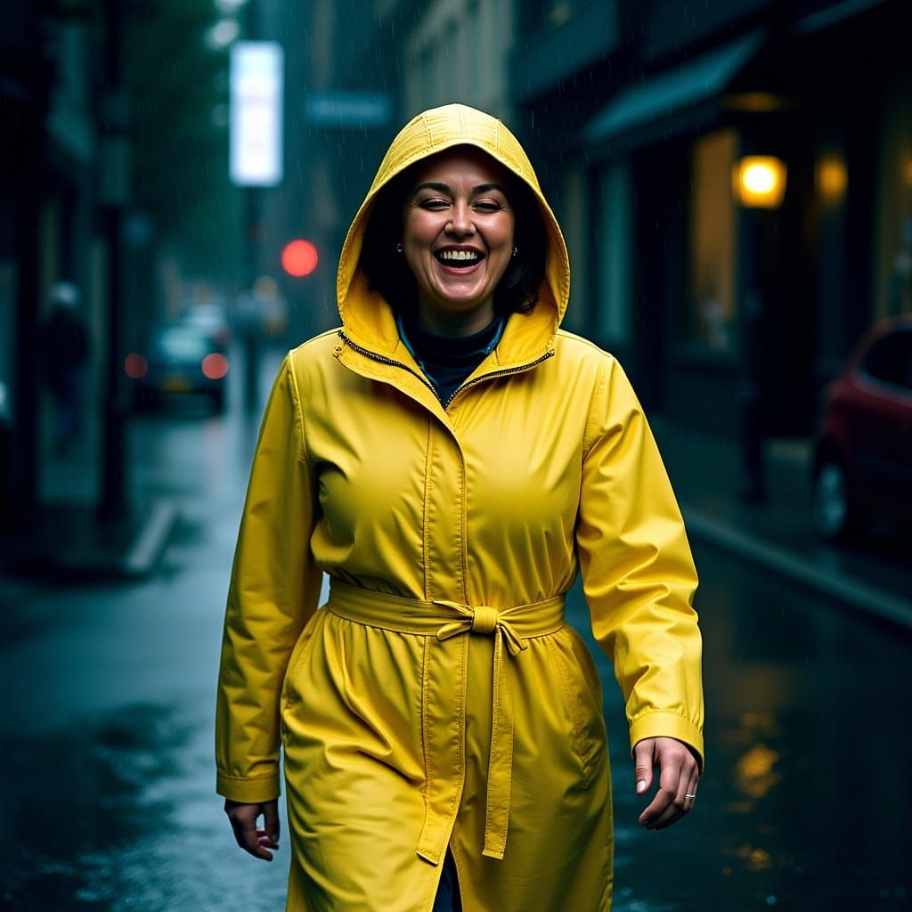 This image shows a curvy woman in a yellow raincoat laughing as she walks on a rain-soaked street. The image is rendered with cinematic lighting, vibrant colors, and a moody atmosphere, reminiscent of film.