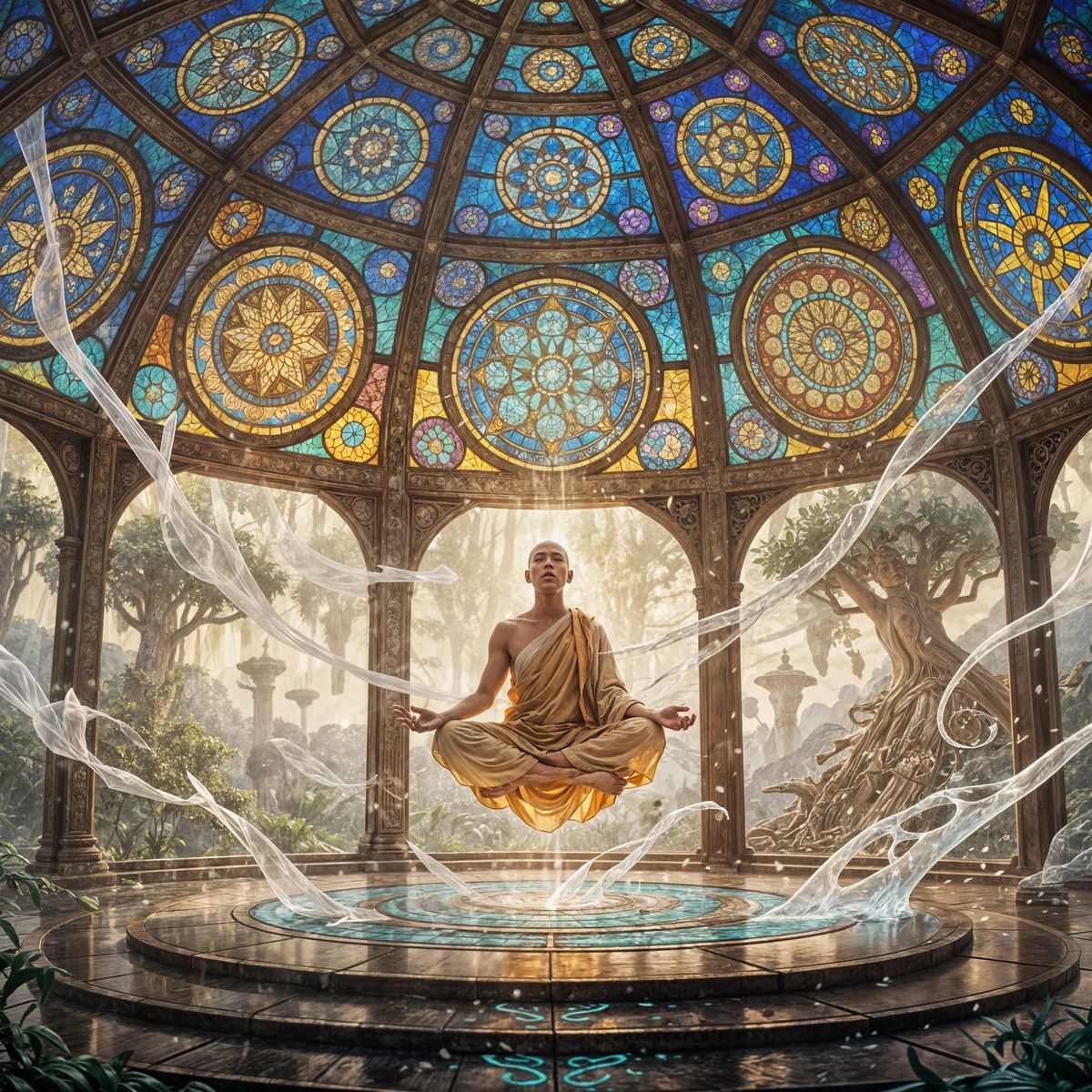 This image depicts a serene monk levitating within a glass temple, bathed in warm sunlight filtering through stained glass. It captures a sense of eternal energy and profound stillness.