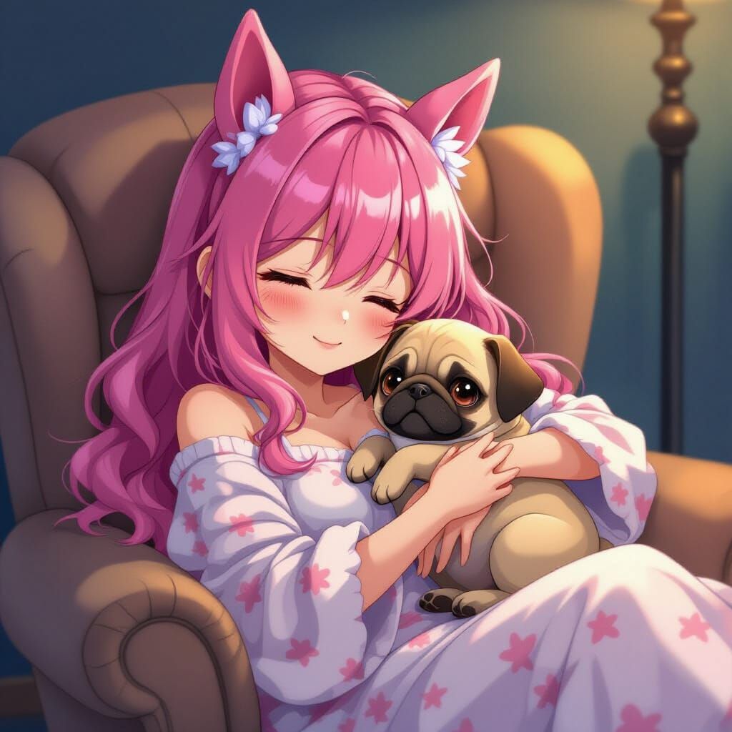 This image shows a pink-haired anime girl with horse ears asleep in a chair, holding a pug puppy. The image is cel-shaded with vibrant colors, resembling a high-quality manga scan.