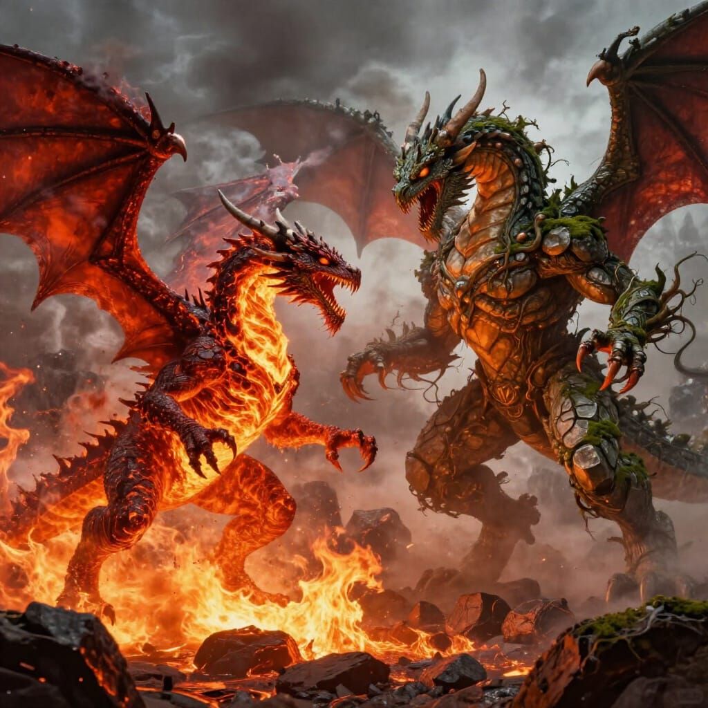 This image depicts a furious aerial battle between a magma dragon and an earth dragon. The scene is set in an ash-filled sky, rendered in a dynamic concept art style with dramatic lighting and vibrant colors.